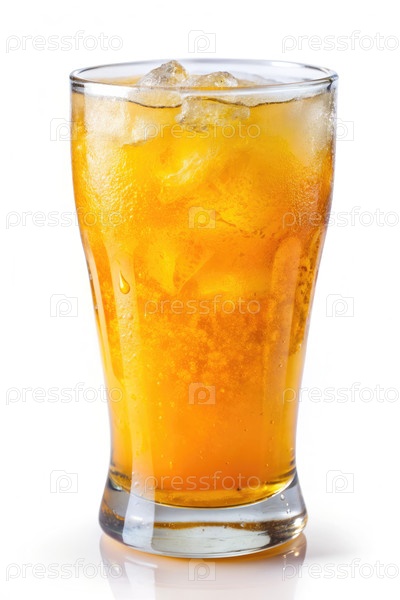 Холодный освежающий напиток с льдом в высоком стакане на белом фоне