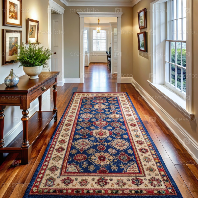 Голубой и бежевый ковер для бегунов в коридоре современного американского дома