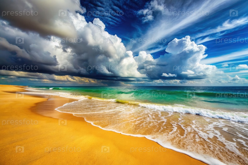 Драматические облака над песчаным пляжем и бирюзовым океаном