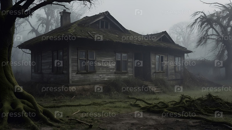 Туманное утро в заброшенном доме в лесу