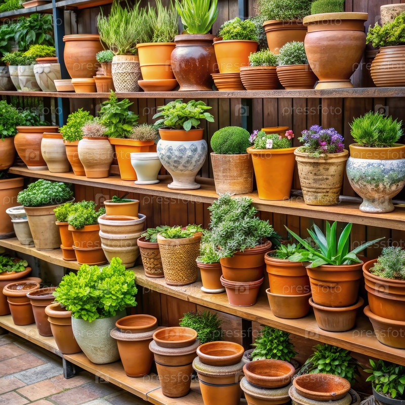 Экспозиция терракотовых горшков, заполненных зелеными растениями на деревянных полках
