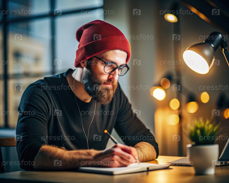 Бородатый человек пишет в блокноте под настольной лампой