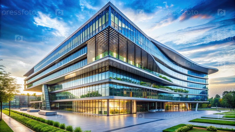 Архитектурное здание с обширным стеклянным фасадом на закате