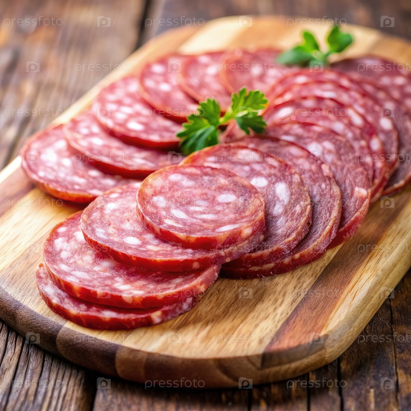 Тонко нарезанное салами на деревянной доске для резки