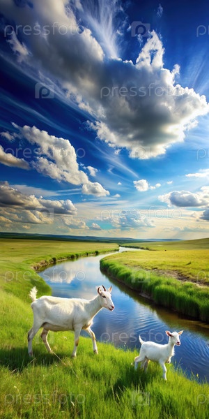 Две белые козы пасутся на солнечной прерии у извилистой реки