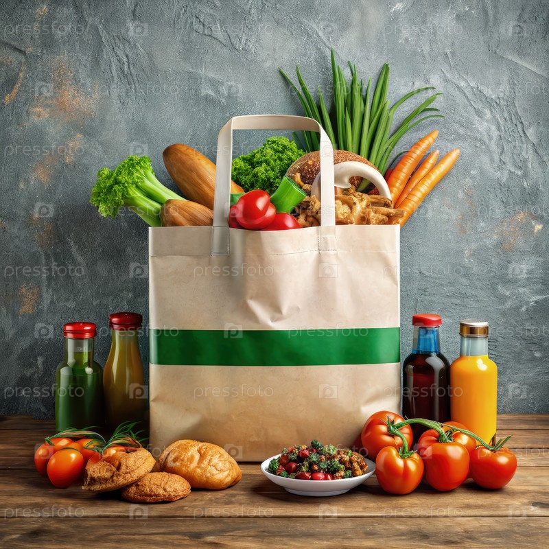 Полный бумажный пакет свежих продуктов на деревянном столе с различными ингредиентами