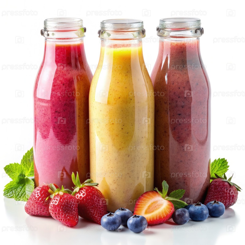 Бутылки свежеприготовленных смешанных фруктовых смуз на белом фоне: На этом изображении показаны три стеклянные бутылки, заполненные яркими свежеприготовленными смешанными фруктовыми смузами. Бутылки расположены бок о бок на белом фоне с несколькими клубн