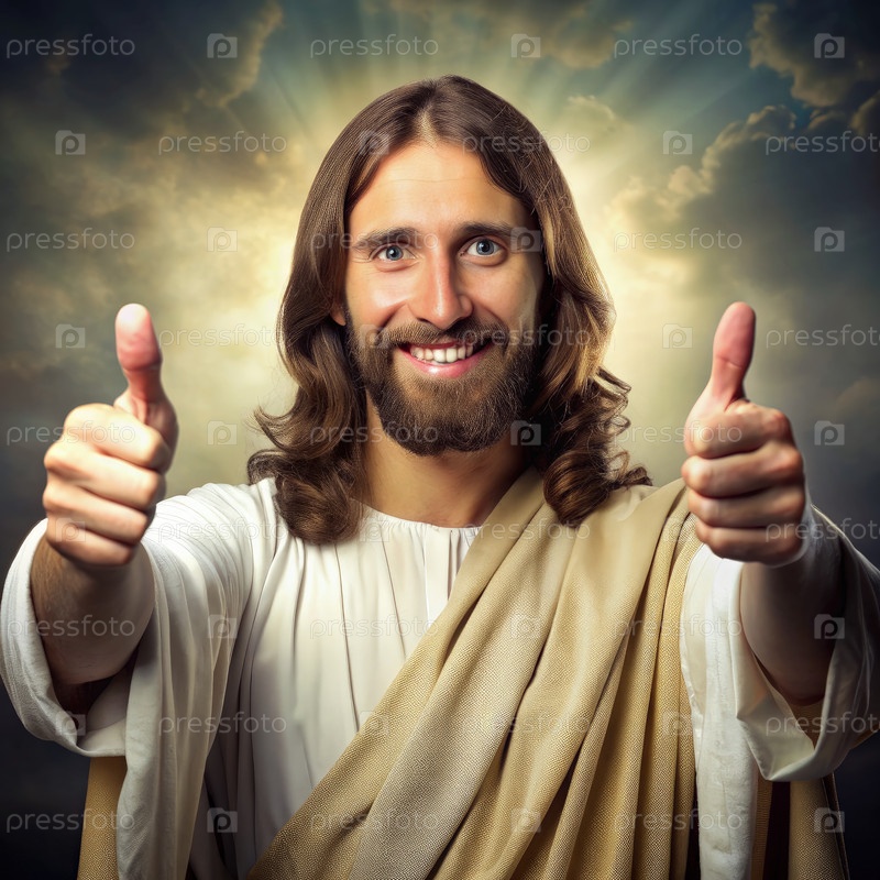 Улыбающийся Иисус поднимает большие пальцы перед облачным небом