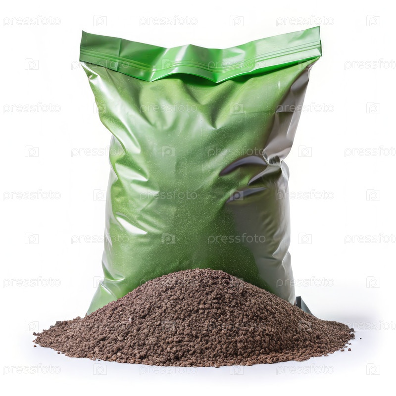 Зеленый пластиковый пакет с гранулярным удобрением, изолированный на белом фоне