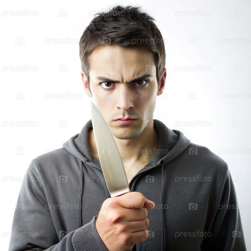 Молодой человек держит нож на белом фоне