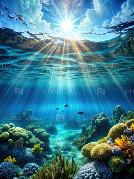 Солнечные лучи освещают яркий коралловый риф под чистым голубым небом