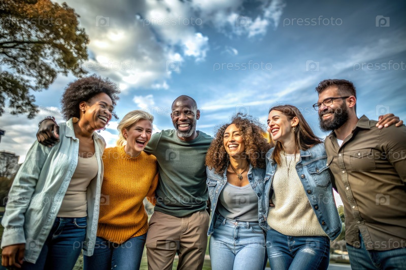 Разнообразная группа друзей смеются вместе в парке в солнечный день