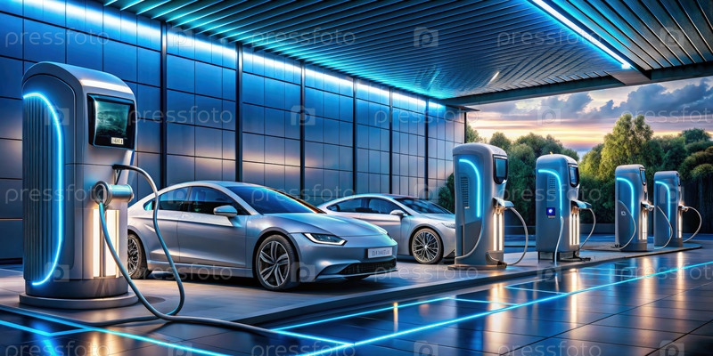 Станция зарядки электромобилей под футуристической крышей на рассвете. генеративный ИИ