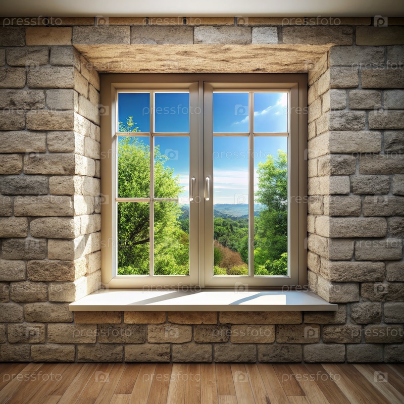 Каменное стеновое окно с видом на пышный зеленый лес