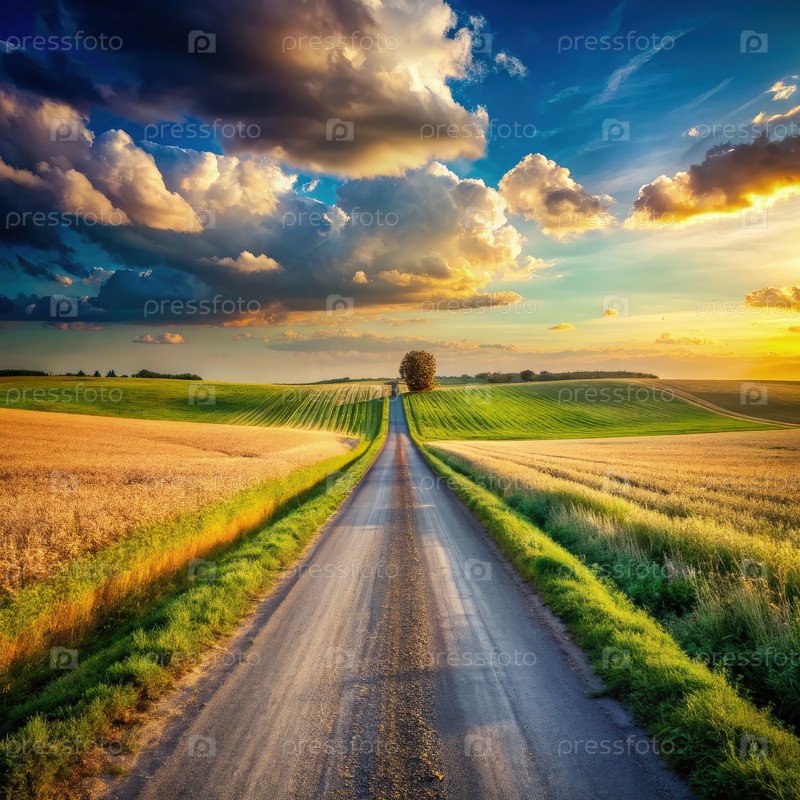 Страновая дорога через извилистые фермерские угодья на закате