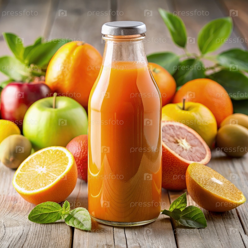 Бутылка свежего апельсинового сока, окруженная цитрусовыми фруктами на деревянном столе