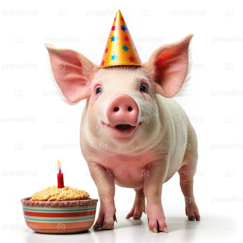 С днем рождения свиньи с праздничной шляпой и тортом. генеративный AI