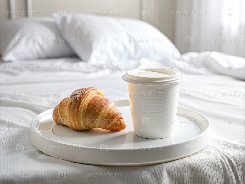 Белая чашка кофе и кроассан на подносе в гостиничном номере