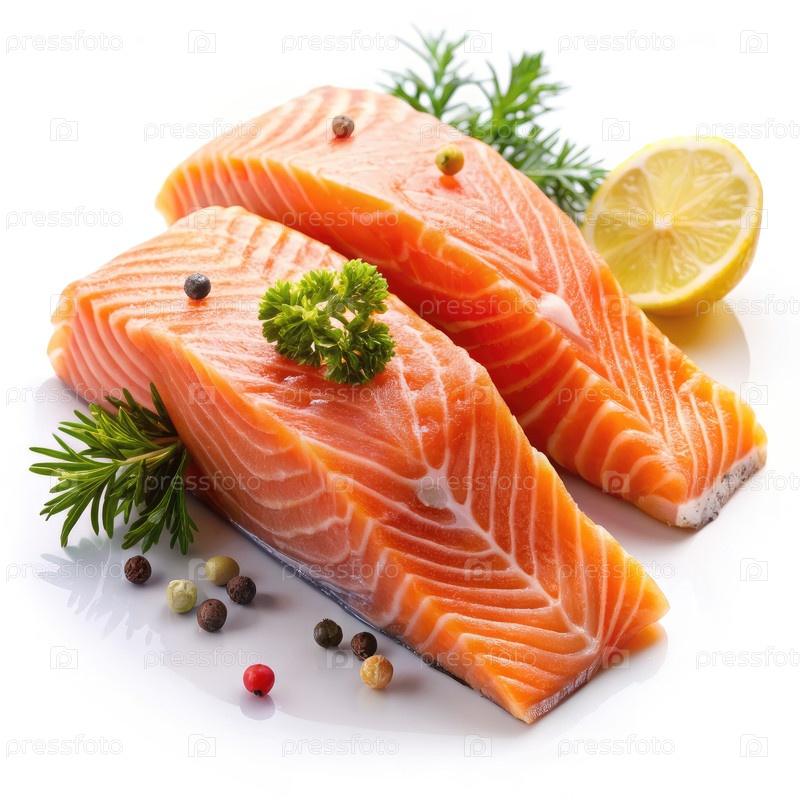 Два сырых филета лосося с травами и перцем на белом фоне