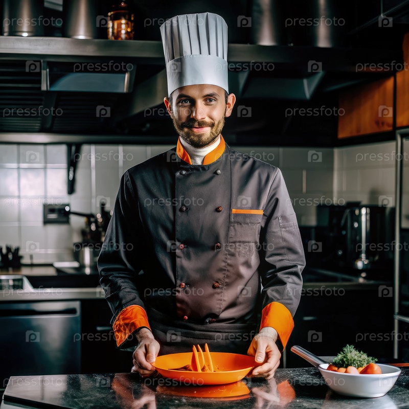 Уверенный шеф-повар в современной кухне готовит еду с помощью Orange Bowl