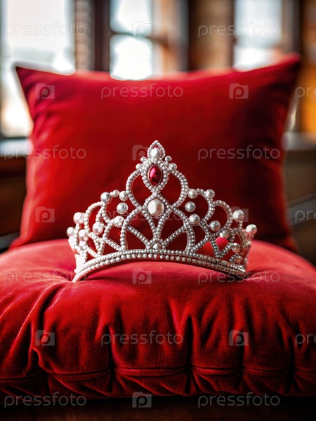 Серебряная тиара лежит на красной бархатной подушке в замке