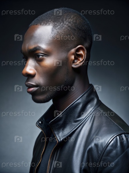 Профильный портрет чернокожего мужчины, одетого в кожаную куртку на сером фоне