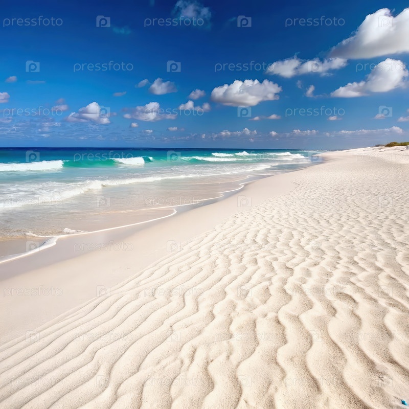 Чистый белый песчаный пляж с мягкими волнами под голубым небом