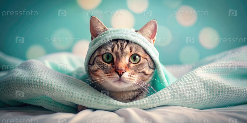 Близкий портрет кота Тэбби, завернутого в светло-синее одеяло