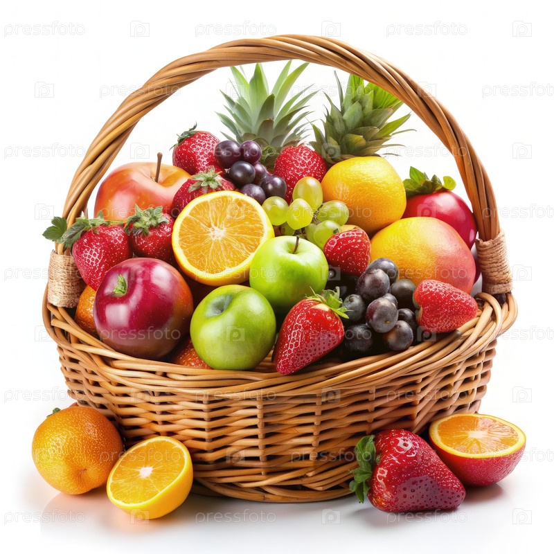 Корзина свежих фруктов с яблоками, апельсинами, клубникой и виноградом
