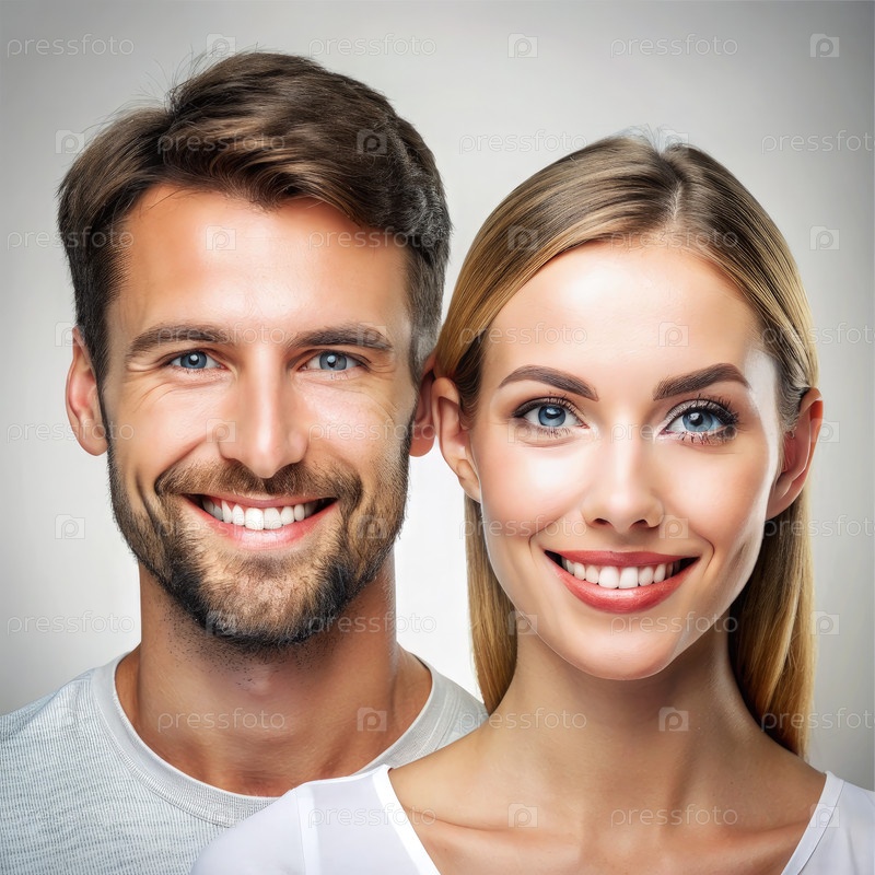 Портрет счастливой пары с улыбающимися лицами и белым фоном