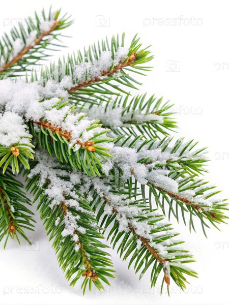 Ближайшее изображение снежной ветки рождественской елки на белом фоне