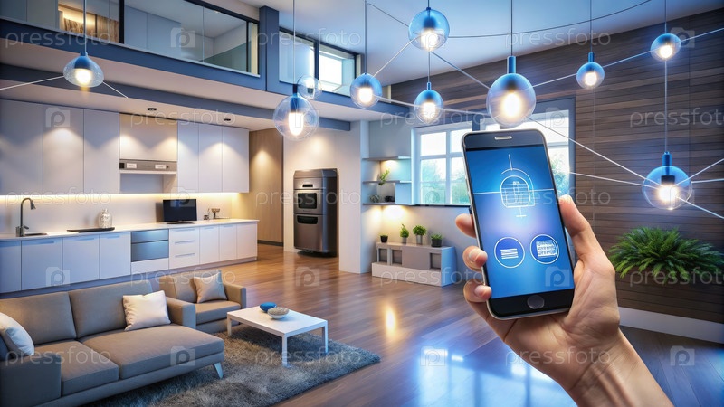 Приложение управления домашним хозяйством в современной гостиной с кухней. генеративный умный ИИ
