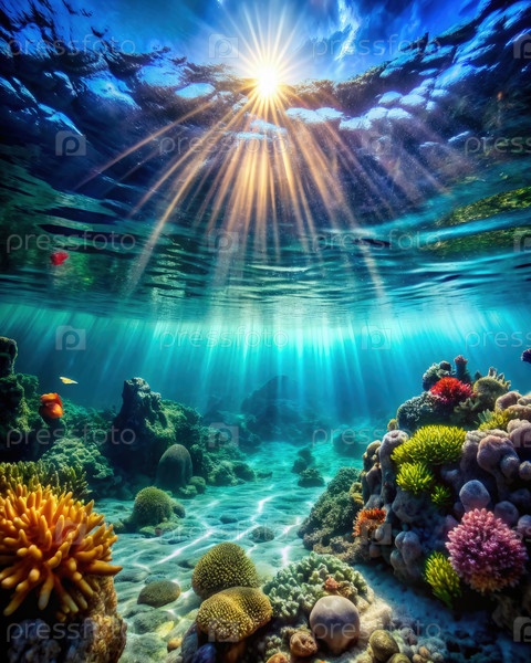 Подводный солнечный свет освещает яркую экосистему коралловых рифов