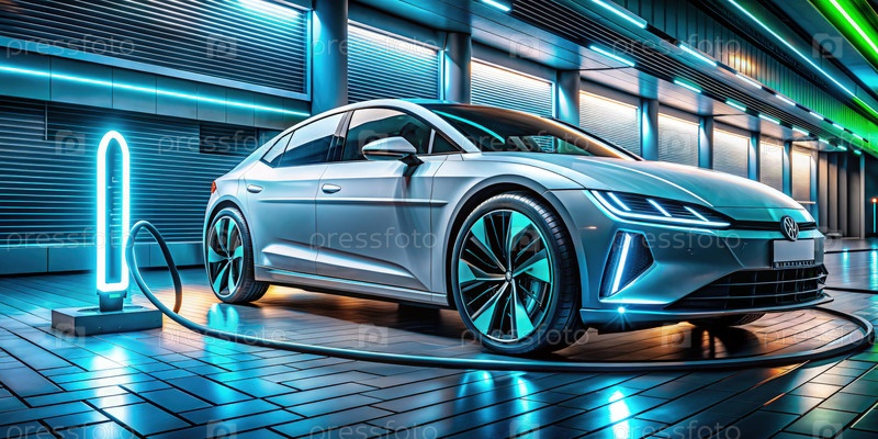 Футуристическая станция зарядки электромобилей под неоновыми огнями. генеративный ИИ