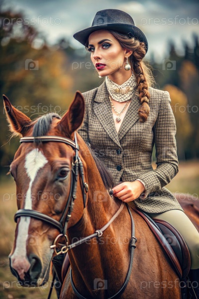 Женщина в плакатной куртке едет на каштановом коне через лес осенью