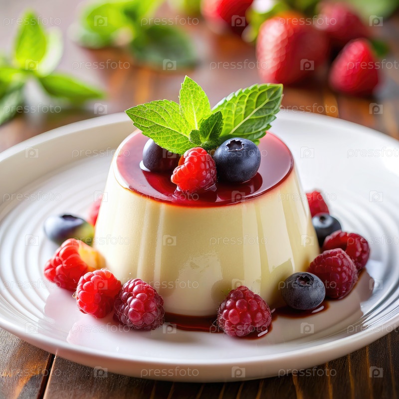 Кремная панна котта с свежими ягодами и мятой. генеративный AI