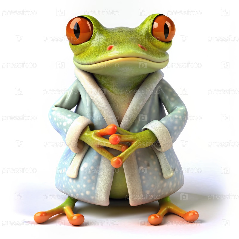 Зеленая лягушка, одетая в голубое платье с белыми пятнами, стоит на белом фоне