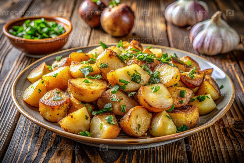 Золото-коричневые поджариваемые картофели со свежими травами на деревянном столе