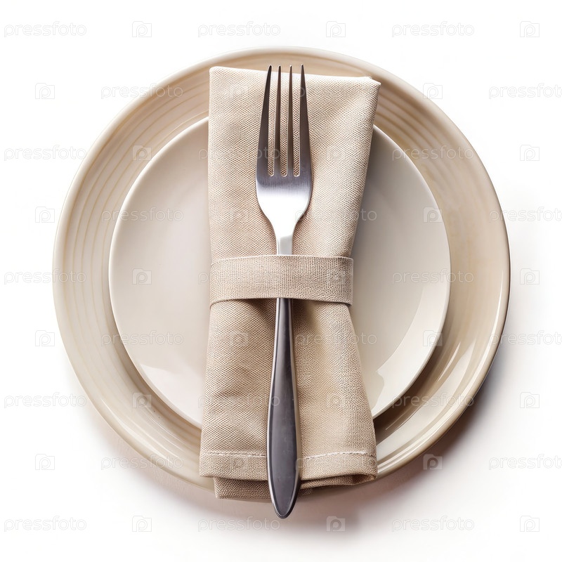 Вилка и салфетка, завернутые в тарелку на ужин