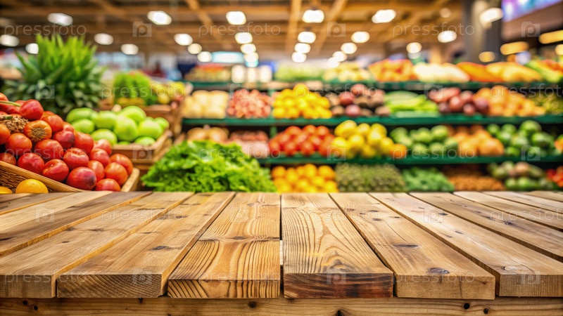 Пустой деревянный стол перед дисплеем свежей продукции в продуктовом магазине