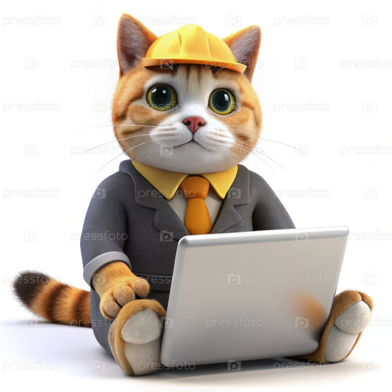 Разработчик типа кошки работает на ноутбуке, нося жесткую шляпу
