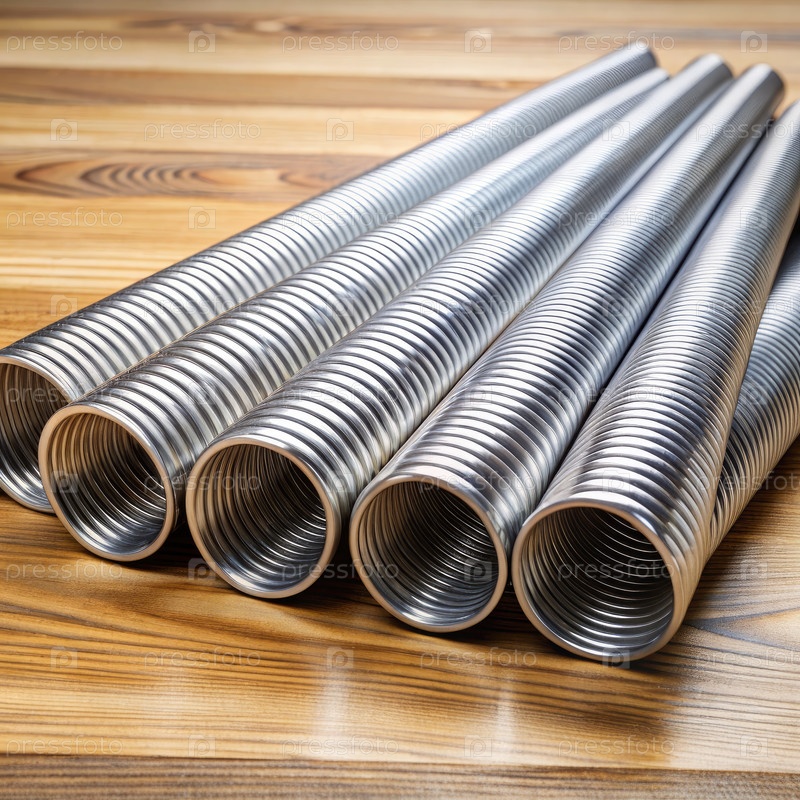 Пять гофрированных металлических труб на деревянной поверхности