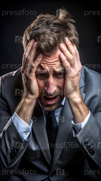 Отчаянный бизнесмен в сером костюме держит голову отчаянием