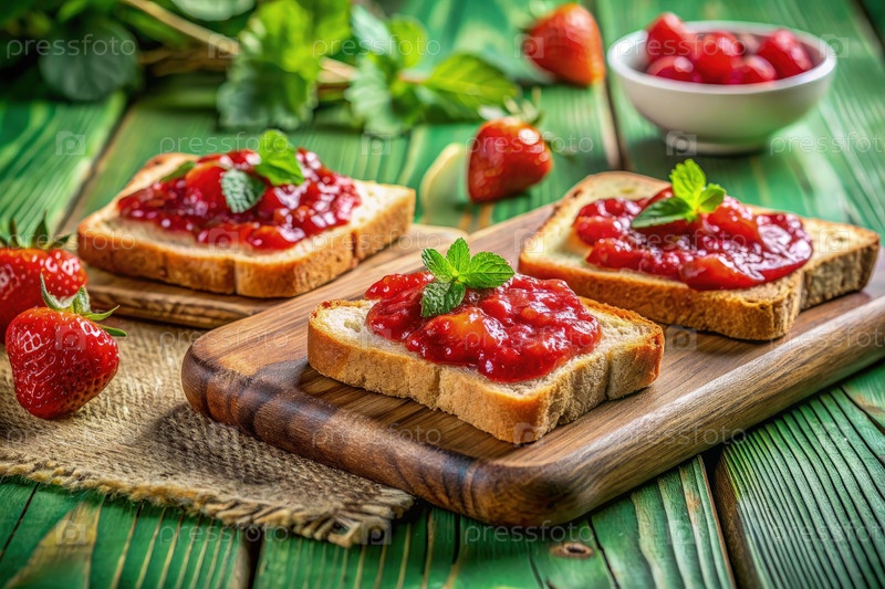 Свежий клубничный варенье на жареных ломтиках хлеба с мятной заправкой