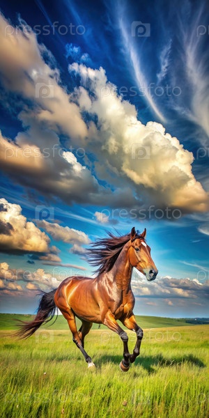 Коричневый конь, бегущий по травянистому поле под облачным небом