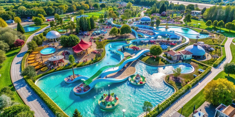 Аэрофотосъемка аквапарка с крутящимися горками и бассейнами. генеративный ИИ