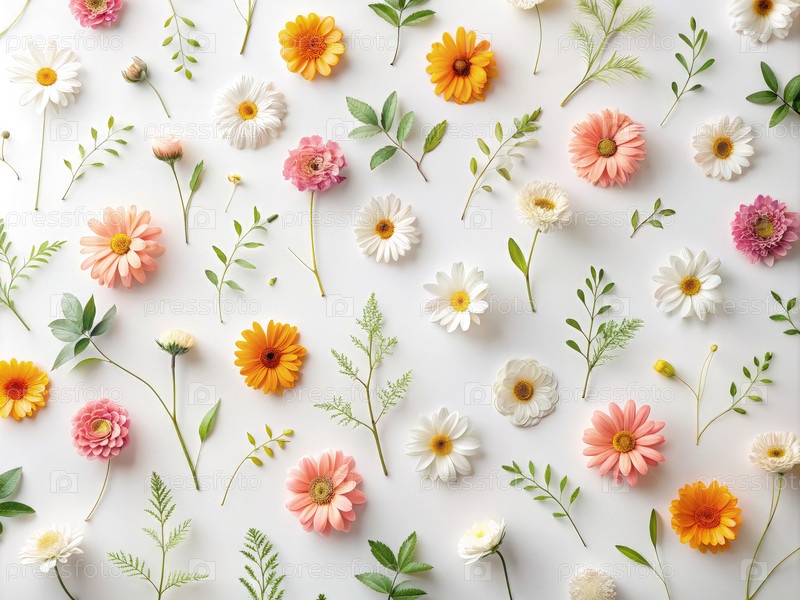 Белый фон Минималистские цветочные обои с ромашками, гербера и зеленью