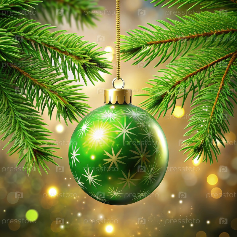 Сверкающее зеленое рождественское украшение, висящее на сосновой ветке