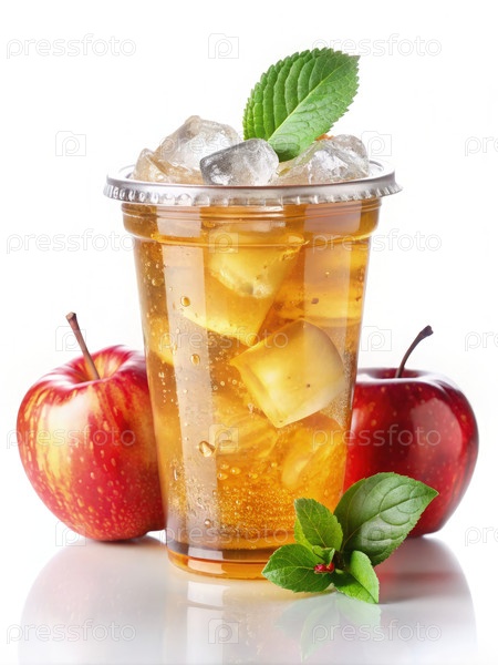Освежающий ледяной яблочный сок в пластиковой чашке с мятой