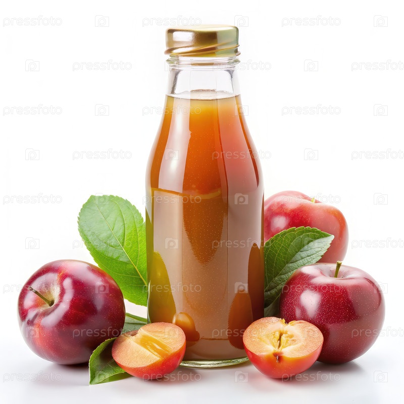 Бутылка свежего китайского сливового сока с нарезанными фруктами и листьями